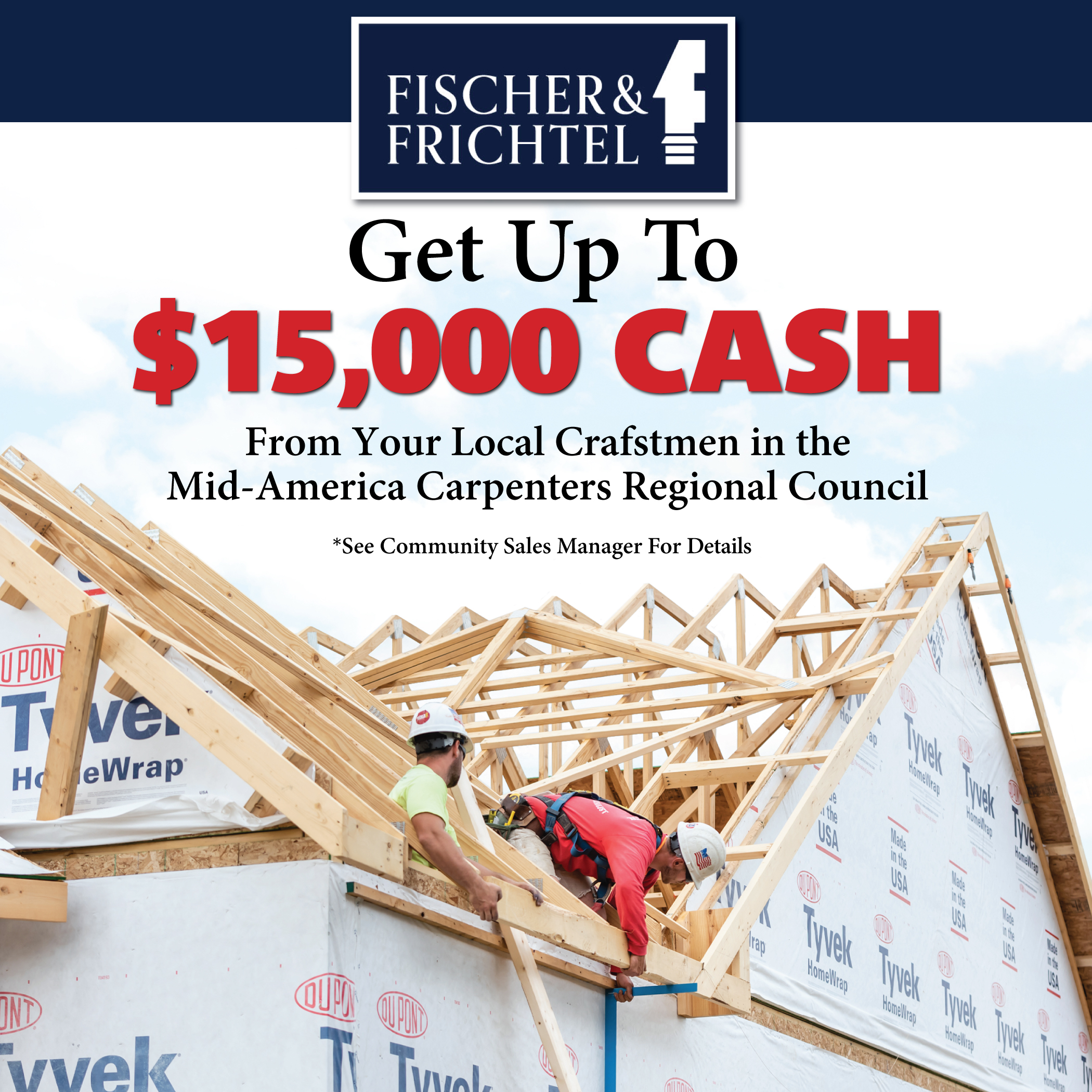 Buy now and receive between $10,000 and $15,000 from your local craftsmen in the Mid-American Carpenters Regional Council! *Limited Time Offer Subject to Change at Any Time. See Community Sales Manager for Details. For information about available homes and communities, call or text Kim at 314-283-6510.